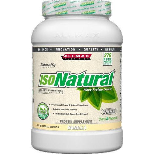 IsoNatural is a pure whey protein, with no artificial flavor, no sugar, and no color added. IsoNatural contains 25 of pure whey protein in every scoop, is virtually fat-free, contains less than 1 gram of carbohydrates and is 97% lactose-free. Allmax IsoNatural does not contain Gluten, Peanuts or Lactose, but does contain residual amounts of Soy Lecithin, which is used to help with the solubility of the protein. This product is perfect for both athletes and health conscious people.